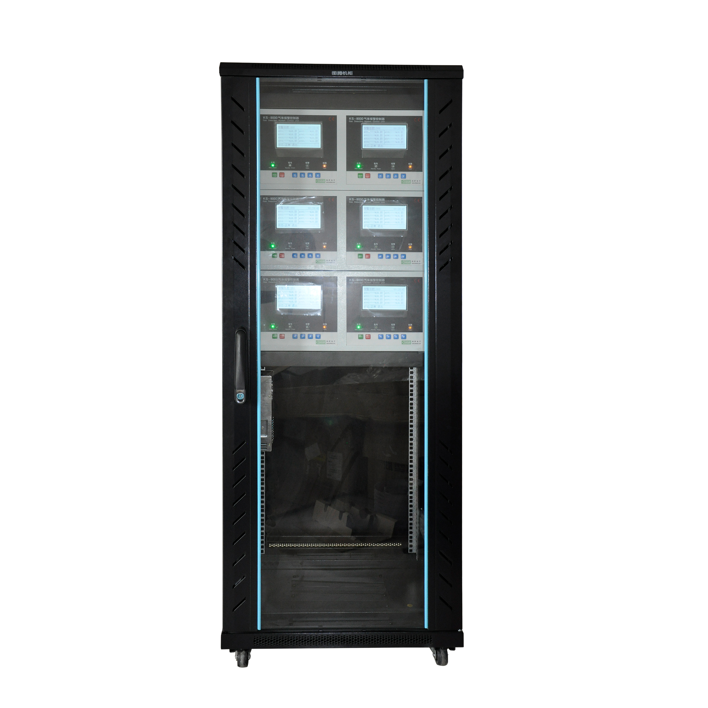 1)整個產(chǎn)品設(shè)計采用立柜式安裝,可靈活選擇1~N個控制模塊(每個模塊控制16通路,可根據(jù)客戶需求配置16~N路通道)即每一通道對應(yīng)一臺氣體探測器。